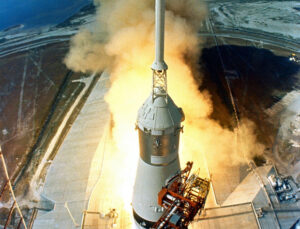 Das Raketenungetüm mit Namen Saturn 5 erhebt sich von der Startrampe 39 A im Kennedy Space Center in Florida, nimmt Fahrt auf, fliegt in Richtung Osten. So nimmt sie zusätzlich noch den Schwung der Erddrehung mit. Die erste Stufe der Rakete ist nach zweieinhalb Minuten leergebrannt, wird abgesprengt und mit einer kurzen Zündung von kleinen Düsen abgebremst, sie fällt in den Atlantik. Die nächsten sechs Minuten treibt die zweite Stufe an, auch sie wird abgetrennt und fällt in den Ozean.