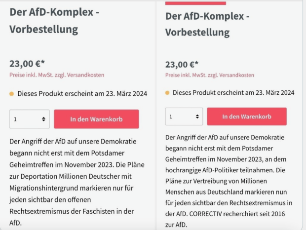 Diese Darstellung ist ganz offenkundig falsch. In dem Correctiv-Text vom 10. Januar 2024 heißt es raunend: „Was Sellner entwirft, erinnert an eine alte Idee. 1940 planten die Nationalsozialisten, viel Millionen Juden auf die Insel Madagaskar zu deportieren. Unklar ist, ob Sellner die historische Parallele im Kopf hat. Womöglich ist es auch nur Zufall, dass die Organisatoren gerade diese Villa für ihr konspiratives Treffen ausgewählt haben: Knapp acht Kilometer entfernt von dem Hotel steht das Haus der Wannseekonferenz, auf der die Nazis die systematische Vernichtung der Juden koordinierten.“ Auch in der Ankündigung des Buchs „Der AfD-Komplex“, mit dem Correctiv offenbar seine Geschichte vermarkten will, kam ursprünglich das Wort „Deportation“ vor. Etwa zeitgleich mit Dowideits Behauptung änderte Correctiv heimlich den Ankündigungstext im Netz.