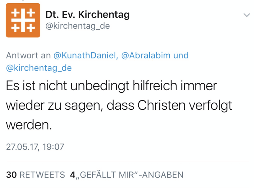 Kurz flackerte ein Stück grausige Realität zwischen kurzen Hosen, orangenen Schals und Birckenstock-Sandalen auf. Die AfD-Vertreterin Annette Schultner wurde buchstäblich niedergesungen – das Halleluja dröhne, damit kein kritisches Wort mein Ohr erreiche. Eigentlich sollte diese Partei und ihre Mitglieder doch exkommuniziert werden; ein Brauch, den sonst nur Katholiken pflegen. Aber bei so viel selbstgeglaubtem Allerlei drängt das Nicht-Gewollte von den bekämpften Rändern in den Vordergrund. Und so entspannte sich per Twitter, nicht am psalmodierenden Ort, eine kurze heftige Diskussion über Christenverfolgung, nachdem man doch eigentlich „Christenverfolgung nicht dramatisieren“ soll, wie Bischof Markus Dröge vielfachen Mord und Unterdrückung zu verharmlosen forderte. Das Bischofswort wurde flugs getwittert: