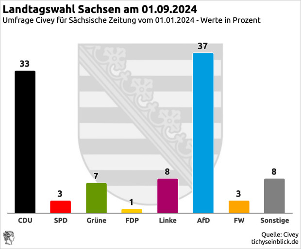 In Sachsen sind die Idiotenparteien jeweils stramm unter 10%. Die schwarz angemalten Grünen von der CDU bei 33%. Es gibt eben noch genug Wähler, die immer noch meinen, die Union sei eine konservative Partei. Wenn eine Partei wie die AfD trotz links-grüner Dauerpropaganda in fast allen Medien solche Werte hat wie in Sachsen, dann kann man sich die Frage stellen, wo stünde diese Partei, wenn neutral über sie und ihr Programm berichtet würde. Die absolute Mehrheit wäre wahrscheinlich zum Greifen nahe. Die Panik im Lager der vorgeblich „demokratischen Parteien“ des Altparteienkartells wird im Laufe des Jahres neue Höchstwerte erreichen. Ob man den Versuch eines Verbotsverfahrens wagen wird, sollte sich im ersten Halbjahr zeigen. Das Urteil des Verwaltungsgerichts in Gera, betreffend den Entzug einer waffenrechtlichen Erlaubnis bei einem AfD-Mitglied, hat vermutlich die Hoffnungen auf ein Verbot der AfD deutlich gedämpft. Das Verbotsverfahren wird wohl dennoch angeleiert, um den bösen AfD-Wählern zu suggerieren, ihre Stimmen würden unter den Tisch fallen, wenn das Verbot käme. Dem Altparteienkartell ist alles zuzutrauen, um lästige Konkurrenz auszuschalten.