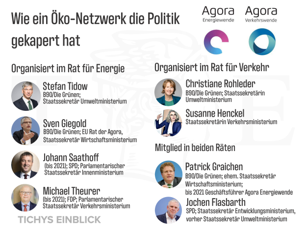 Offensichtlich ist auch eine Doppelspitze im Bundeswirtschaftsministerium und im Bundesumweltministerium: Jeweils zwei Agora-Leute sind dort positioniert. Christiane Rohleder, Staatssekretärin wie Tidow im Umweltministerium, ist zwar erst seit Ende 2021 im Agora-Rat. Sie war jedoch persönliche Referentin von Ulrich Kelber im Justizministerium. Kelber war selbst im Rat der Agora ab 2012 und damit von Anfang an dabei. Wie Rohleder ist im letzten Jahr die Staatssekretärin Susanne Henckel aus dem Bundesverkehrsministerium neu hinzugekommen. Sie war früher Hauptgeschäftsführerin des Bundesverband Schienennahverkehr und Geschäftsführerin des Verkehrsverbund Berlin-Brandenburg.