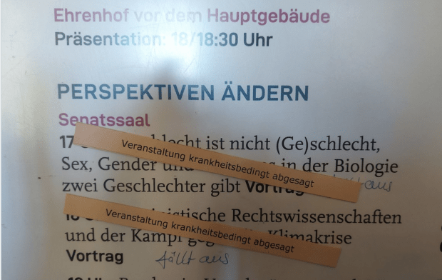 Der Universitätssprecher erklärte auf Nachfrage von TE, wer diese Überklebung anbrachte: „Mir ist nicht bekannt, wie diese Ankündigung zustande kam. Der nachfolgende Beitrag fiel krankheitsbedingt aus. Wer und aus welchem Grund diesen Zettel so geklebt hat ist mir unbekannt. Die HU kommunizierte den Grund der Absage offen, wie in den Medien ja leicht ersichtlich ist.“