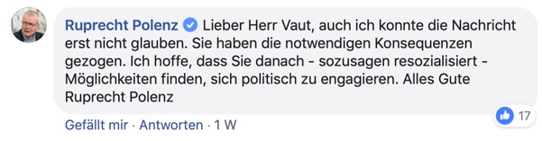 Trost gab es auch vom politischen Gegner – Angela Merkels früherem Generalsekretär und jahrelangen Vorsitzenden des ZDF-Fernsehrats Ruprecht Polenz, der sich nach dem Rückzug aus dem Bundestag in den sozialen Netzen als heftiger Kämpfer inszeniert für alles Gute und gegen alles Schlechte – insbesondere dessen Verkörperung in Form der AfD. Polenz wirkt derart allgegenwärtig auf twitter und facebook, so omnipräsent in den Kommentaren, dass Spötter bereits feixen, er müsse eine eigene kleine Trollfabrik betreiben.