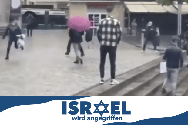 Ein Amateurvideo aus Basel macht fassungslos: Am Rande einer antiisraelischen Kundgebung, auf der die Flaggen verschiedener arabischer Staaten sowie die die Palästinensische Flagge zu sehen sind, hält eine junge Frau eine Israel-Flagge hoch. Zunächst lösen sich immer mehr Leute aus der Demonstrantengruppe, darunter mehrere Frauen mit Kopftuch, schließlich beginnen die ersten auf die Frau zuzurennen. Die Frau ergreift die Flucht, daraufhin wird sie mindestens bis in die nächste Gasse verfolgt, dann bricht das Video ab.
