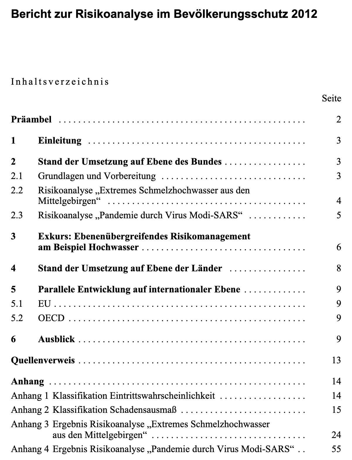 Aber die Bundesregierung wurde nicht nur aktuell gewarnt. Sie sitzt seit 2012 auf  ihrem eigenen »Bericht zur Risikoanalyse im Bevölkerungsschutz«, ohne aus diesem je Konsequenzen gezogen zu haben. In dieser Risikoanalyse geht es pikanterweise sowohl um die nötige Vorsorge zum Hochwasserschutz wie um die Vorbereitung auf eine »Pandemie durch Virus „Modi-SARS“«.