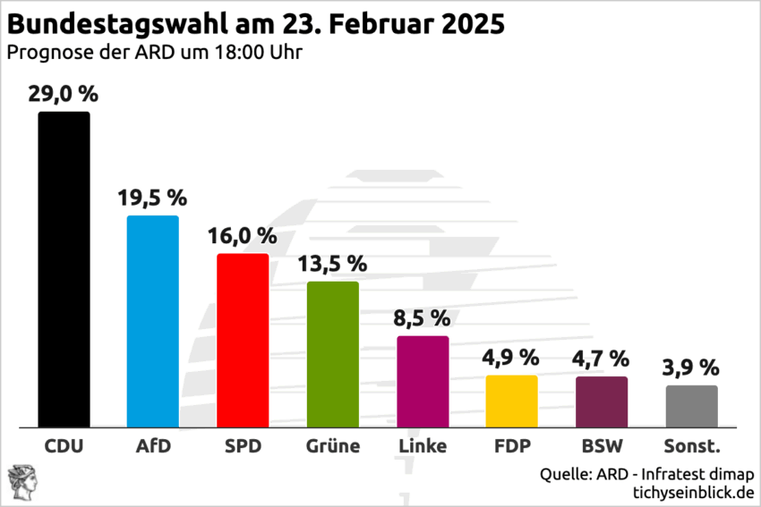 Die Union erreichte laut ZDF 28,5 Prozent der Stimmen. Damit ist der Weg frei für Friedrich Merz. Der CDU-Vorsitzende wird voraussichtlich der zehnte Kanzler in der Geschichte der Bundesrepublik. Mit welchen und wie vielen Koalitionspartnern ist indes noch unklar. Laut der Prognose steht die FDP bei 5,0 Prozent. Schaffen die Liberalen den Einzug in den 21. Bundestag, wird Merz mit SPD und Grünen regieren – scheitert die FDP, kann sich Merz aussuchen, mit welchem der beiden er rot-grüne Politik umsetzen will.