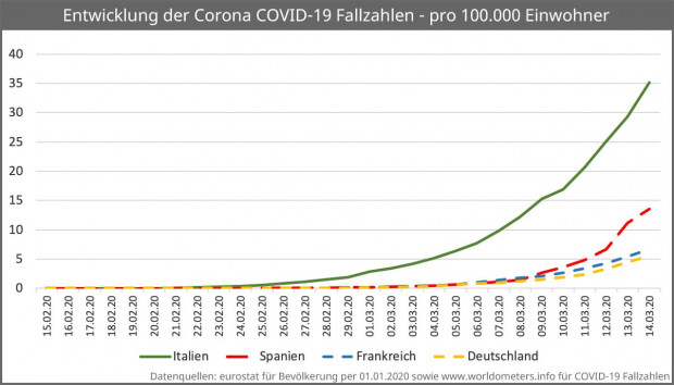 Am vergangenen Samstag wurden in Spanien Ausgangssperren verhängt. Die Zahlen rechtfertigen diesen Schritt auf den ersten Blick nicht, hat Spanien doch weit weniger Erkrankte als Italien (fast 25.000 Fälle), ist in der Größenordnung (an die 8.000 Erkrankte) näher an Deutschland (gegen 6.000 Fälle). Ein genauerer Blick auf die Statistiken ändert dies jedoch.