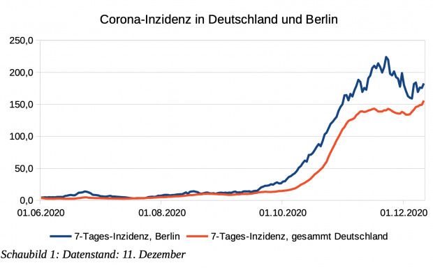 Die Zahlen des Corona-Geschehens haben sich erneut verschlechtert: Am Sonntag, dem 13. Dezember ergibt sich eine 7-Tages-Inzidenz von 169 Fällen pro hunderttausend Einwohner. Wobei es sich um Infizierte handelt, nicht um Erkrankte. Einen Sonntag zuvor, am 6. Dezember, betrug diese Maßzahl 142 Fälle je Hunderttausend. Damit zeigt sich ein ähnlicher Trend wie in den USA Mitte dieses Jahres: Auf eine kurze, vermeintliche Beruhigung der Situation und sinkende Inzidenz folgt dann ein schneller Anstieg. Folgen wir dem USA-Modell, kommt als nächstes der restlose Verlust der Kontrolle über das Virus.