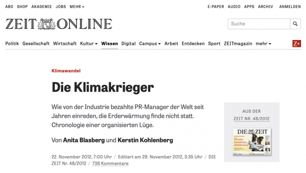 In der ZEIT erschien schon im November 2012 eine umfangreiche Reportage von Anita Blasberg und Kerstin Kohlberg unter der Titel „Die Klimakrieger. Wie von der Industrie bezahlte PR-Manager der Welt seit Jahren einreden, die Erderwärmung finde nicht statt. Chronologie einer organisierten Lüge.“