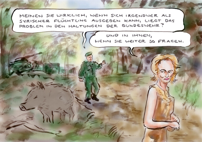Klar ist mittlerweile: Der betreffende Soldat war ungeeignet für die Offizierslaufbahn. Das zeigte seine Masterarbeit überdeutlich. Klar ist auch, er hatte mit illegal beschatten Waffen zu tun; erstaunlich, dass das nicht der Bundeswehr auffiel, sondern österreichischen Polizisten in Wien. Das ist die eine Seite des Versagens, und die Verantwortung dafür liegt bei Ursula von der Leyen, immerhin seit drei Jahren Ankündigungsministerin für Uniformierte. Allerdings hat sie sich mehr um Transgender-WCs gekümmert als um innere Führung. Da ist mal ein Bundesminister zurückgetreten, weil er die Einkaufschips eines Verwandten empfahl. Was muss einem Bundesminister heute widerfahren, bevor er zurücktritt?