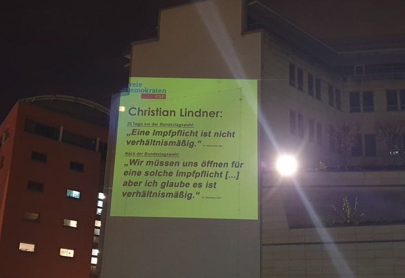 Auch in Dresden kam es zu Protesten mit mehreren Hundert Teilnehmern. Dort wurden Botschaften an Hauswände projiziert, auf denen Aussagen von Bundeskanzler Olaf Scholz und Finanzminister Christian Lindner gegen eine Impfpflicht vor der Wahl mit widersprechenden Aussagen nach der Wahl verglichen werden.