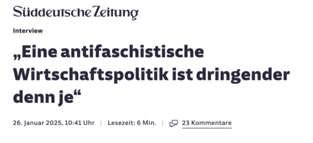 Zum breiten Angebot gehört eine „antifaschistische Wirtschaftspolitik”, beworben in der Süddeutschen von einer Expertin namens Isabella Weber (die viel Schulden und viel Staat zur Faschismusbekämpfung für nötig hält).