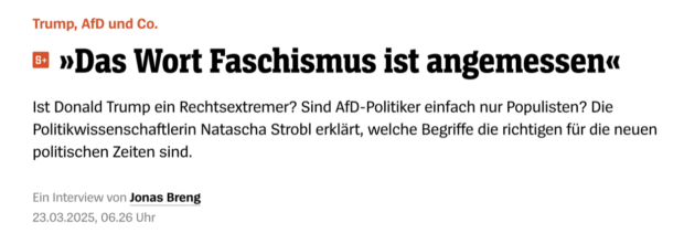 In der Spiegel-Redaktion, die 2024 Trump, Marine Le Pen und Björn Höcke zusammen mit der Zeile „Wie Faschismus beginnt“ aufs Titelblatt packte, gab es anscheinend das Bedürfnis, sich noch einmal rückzuversichern, ob sich das F-Wort auch wirklich derart schweizermesserhaft anwenden lässt. Dochdoch, auf jeden Fall, versicherte die angefragte Expertin, Österreicherin Natascha Strobl.