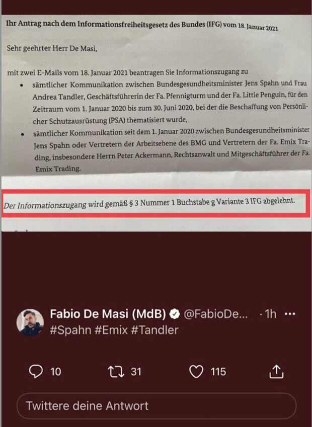 Der zweite bis heute nicht aufgeklärte Komplex betrifft die Beauftragung der Schweizer Firma EMIX durch das Bundesgesundheitsministerium. Spahn kontaktierte schon am 9. März 2020, dem Tag, an dem sein Ministerium das so genannte Inhouse-Verfahren beschloss, über sein Mobiltelefon Andrea Tandler, Tochter des ehemaligen bayerischen Finanzministers Gerold Tandler. Offenbar wusste sie früher als die meisten anderen darüber Bescheid, welches Geschäftsfeld durch den Ministeriumsentscheid gerade entstanden war. Tandler vermittelte umgehend für das Schweizer Unternehmen EMIX einen Masken-Liefervertrag mit dem Ministerium. Die Besonderheit hier: Selbst als Spahns Beamten schon klar war, dass sie viel zu viel Masken bestellt und das Budget gesprengt hatten, durfte EMIX noch liefern. Das Landgericht München I verurteilte Tandler 2023 zu vier Jahren und fünf Monaten Haft, da sie und ihr Lebensgefährte versucht hatten, die von EMIX gezahlte Provision von gut 50 Millionen Euro an der Steuer vorbeizubringen. Auf die Fragen des damaligen Bundestagsabgeordneten der Linken Fabio di Masi nach den Details des EMIX-Deals verweigerte das Gesundheitsministerium unter Spahn seinerzeit jede Antwort – mit Hinweis auf ein „Geheimhaltungsinteresse“.