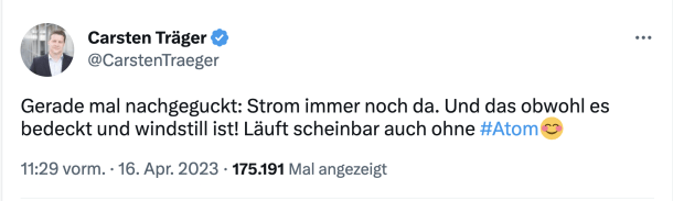 Der SPD-Bundestagsabgeordnete verkündete schon am Sonntag den vollen Erfolg der Atomkraft-Abschaltung vom Samstag, als die letzten drei deutschen Kernkraftwerke zwangsweise vom Netz gingen: „Strom immer noch da.“