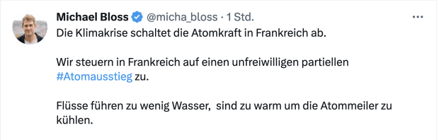 Der eine oder andere kennt den grünen Europaabgeordneten schon als wandelndes Kompetenzzentrum für Energiefragen. Michael Bloss freute sich auf Twitter, dass es jetzt auch der französischen Atomkraft wegen der „Klimakrise“ an den Kragen gehen würde – wegen der Trockenheit und dem fehlenden Kühlwasser.