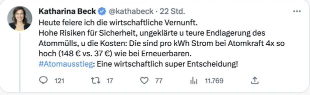 Katharina Beck wirkt als Finanzpolitische Sprecherin der grünen Bundestagsfraktion. Sie fühlte das Bedürfnis, auf Twitter einmal konkret vorzurechnen, wie günstig das Abwürgen der Kernkraft sich auf die Stromrechnung auswirkt. Der Fachfrau zufolge kostet eine Kilowattstunde Atomstrom nämlich 148 Euro, Strom aus Sonne und Wind dagegen nur supergünstige 37.