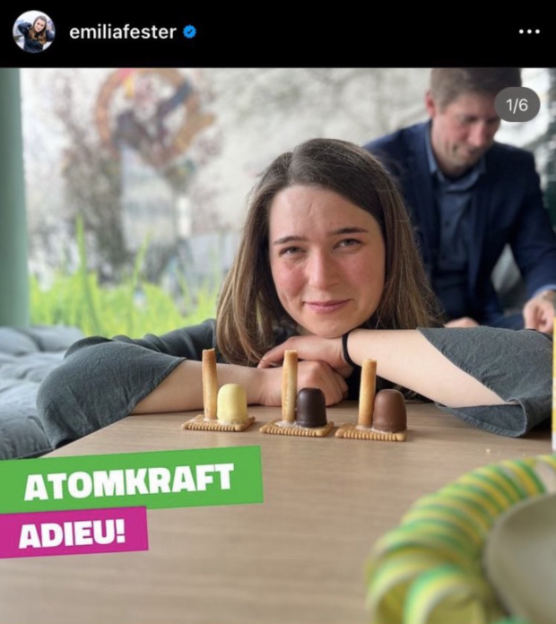 Auch das Kernkraft-Aus kommentierte die Politikerin fast nonverbal, indem sie sich aus Keksen und einem Gebäck, das einmal einen heute inkorrekten Namen trug, drei leckere Kernkraftwerkchen zum Verspachteln aufbaute.