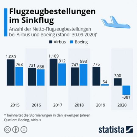 Auch die Hightech-Industrie wie der Flugzeugbau schmiert ab. Die am Staatstropf hängende, schwindsüchtige Lufthansa mustert in ihrer Flotte den europäische Wundervogel und Großraumjet A 380 aus. Airlines stürzen durch die anhaltende Corona-Krise mit dem fast totalen Einbruch des weltweiten Flugverkehrs weiter ab, stornieren Flugzeugbestellungen, die bei Herstellern wie Airbus und Boeing zehntausende Arbeitsplätze kosten werden – siehe Grafik.