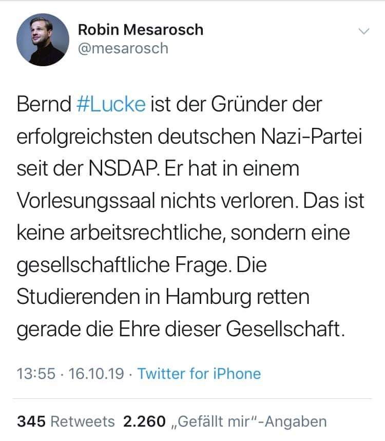 Dass in der Uni Hamburg die ganze Lucke-Farce runtergespielt wird, zeigt allenfalls, dass auch ein Professorentitel oder eine Führungsposition an der Uni nicht im geringsten die Gewähr dafür bietet, dass man es mit ehrenhaften Menschen zu tun hätte! Für die „Studierenden“ gilt das gleich überhaupt! Wobei sich bei DER Veranstaltung gezeigt hat, wie schwachsinnig dieser Genderquatschbegriff „Studierende“ ist, weil die dort aktiven „Studierenden“ ja wohl eher „Studienverweigernde“ waren!