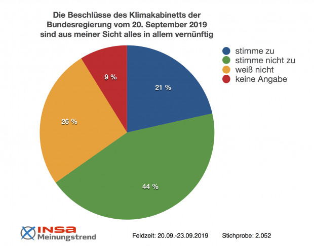 Als nicht überzeugend sehen 44 Prozent die Regierungsmaßnahmen zur CO2-Verminderung an. Weitere 26 Prozent haben sich bisher keine Meinung gebildet, neun Prozent sind nicht sicher, ob sie das Paket vernünftig finden sollen oder nicht.