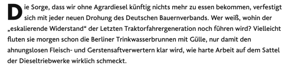 „Die Sorge, dass wir ohne Agrardiesel künftig nichts mehr zu essen bekommen, verfestigt sich mit jeder neuen Drohung des Deutschen Bauernverbands. Wer weiß, wohin der ‚eskalierende Widerstand‘ der Letzten Traktorfahrergeneration noch führen wird? Vielleicht fluten sie morgen schon die Berliner Trinkwasserbrunnen mit Gülle, nur damit den ahnungslosen Fleisch- und Gerstensaftverwertern klar wird, wie harte Arbeit auf dem Sattel der Dieseltriebwerke wirklich schmeckt.“