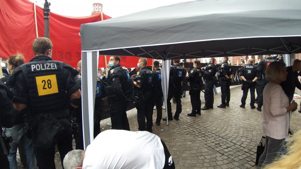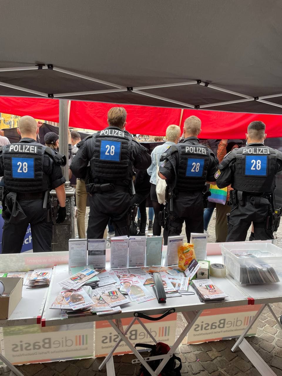 Die Polizei reagiert schnell, bevor die Lage weiter eskaliert: Ein Kordon wird um den Stand gebildet, um die Basisdemokraten vor weiteren tätlichen Angriffen zu schützen. Doch hinter einem Polizeikordon kann man keine Wahlwerbung mehr betreiben. Sie ist vom Grundgesetz geschützt, doch wenn die Demokratie nicht mehr gelebt werden kann, dann ist sie tot.