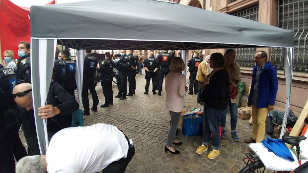 22 Infostände hatte dieBasis in Frankfurt angemeldet, und alle 22 Infostände waren von der Stadtverwaltung genehmigt worden. Zu Beginn habe es Polizeischutz gegeben, berichtet Marketakis. „Da kamen immer zwei oder auch vier Polizeibeamte, haben nachgesehen, dass bei uns alles in Ordnung ist, wir nicht aggressiv auftreten aber auch niemand uns gegenüber aggressiv wird.“ Nach und nach habe sich die Routine zur allseitigen Zufriedenheit eingependelt – kein einziger sicherheitsrelevanter Zwischenfall in all‘ den Wochen.