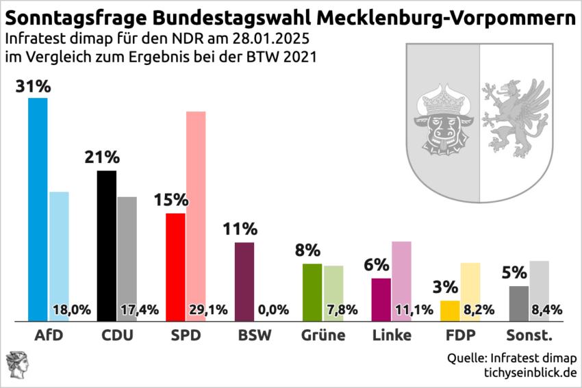 Anders sah das – ebenfalls vor der Mittwochsabstimmung – bei Infratest für den NDR zur Bundestagwahlabsicht in MeckPomm im Vergleich zur letzten Bundestagswahl aus. AfD plus 13 Prozentpunkte, CDU plus 3,6 Punkte, SPD minus 14,1 Punkte, Grüne minus 0,2, Linke minus 4,1, FDP minus 5,2. Ganz anders als früher wandern Wähler nicht von der SPD zu den Grünen oder umgekehrt, sondern zu AfD, BSW und CDU. Es handelt sich hier nur um MeckPomm, aber der Trend im Saldo von der SPD zur CDU zeichnet sich für mich ab.