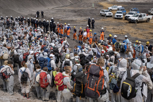 Die Demonstranten rutschten die Tagebau-Hänge hinunter; Appelle der Polizei, stehenzubleiben, bleiben ungehört. Immerhin herrscht Lebensgefahr, wenn die bis zu 40 Meter hohen Abbruchkanten nicht mehr zum Stehen kommen.
