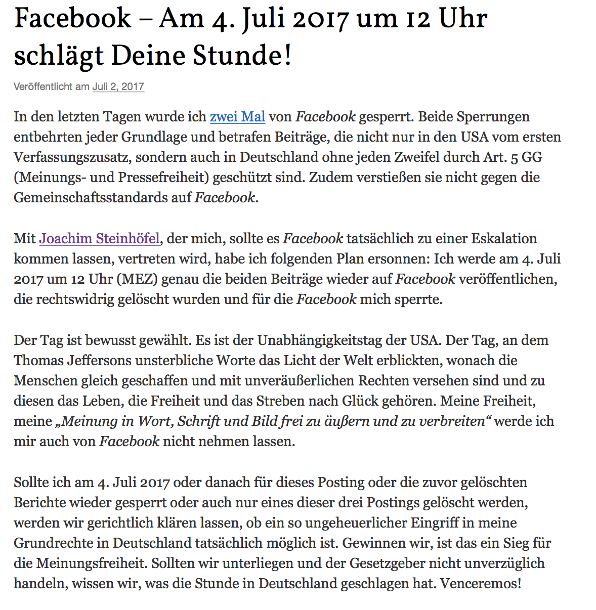 Und wir dürfen eines nicht vergessen: dieses Maas´sche „Freitagsgesetz“ dient vorwiegend oder sogar ausschließlich dem „Kampf gegen rechts“, also v.a. dem Kampf gegen unliebsame Regierungskritiker. Wenn von FB z.B. linksextremistische Beiträge der Antifa veröffentlicht werden, hat FB man von Maas und seinem Durchsetzungsgesetz nicht das Geringste zu befürchten, außer vielleicht einen Orden für Zivilcourage 😉