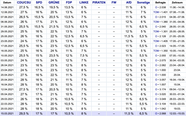 Ich hatte eine schnelle Reaktion von Forsa erwartet, nach dem Motto „Grüne nach Parteitag wieder im Aufwind!“. Mal sehen, was Baerbocks Wahlkampfteam jetzt auspackt. Frau*man hat sicher noch ein paar Trümpfe in der Hand, die frau*man sich für das Absacken unter 20 Prozent aufgehoben hat. Wenn die anderen Demoskopen folgen, wird wohl die nächste Stufe gezündet.