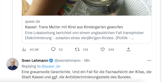 Lehmann bezog sich in seiner Mitteilung auf eine Meldung des Magazins „queer“, die so ähnlich auch von der „Frankfurter Rundschau“ wiedergegeben wurde: „Trans Mutter mit Kind aus Kindergarten geworfen“, hieß es bei „queer“. In der „Frankfurter Rundschau“ hieß es ganz ähnlich: „Da ist die Tür“: Vierjähriges Kind und trans* Mutter aus Kindergarten geworfen“.