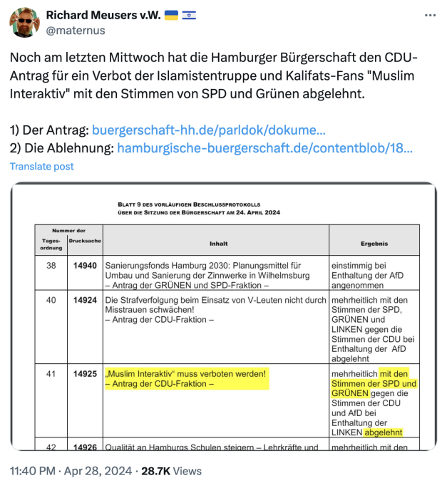 Wenn, dann bitte richtig berichten. Beide lehnten nicht das Verbot der islamistischen Gruppe ab, sondern die CDU hatte beantragt an Frau Faeser einen Antrag zu stellen, sie möge die Möglichkeit eines Verbots prüfen. Merke: Weder die CDU Hamburtgs noch die regierenden Hamburger Parteien hätten die islamistische Gruppe verbieten können, nur die Bundesinnenministerin kann das. Mir wäre persönlich auch wohler, wäre das möglich, denn dann könnte es nicht mehr zu Demoanmeldungen kommen, die man nicht verbieten kann. Der Hamburger Polizeipräsident hat nochmal sehr klar dargelegt, warum es nicht möglich war die Demo im Vorwege zu verbieten. Es gab schlicht keine Gewalt. Aber man versucht zu prüfen, ob nicht einige der Wortmeldungen und Transparente Einzelner strafbar gewesen sind und das dann zu verfolgen. Etwas differenzierter hätte der Autor hier auch schreiben können – aber das wäre vermutlich bei kaum einem Leser und Kommentator hier gut angekommen.