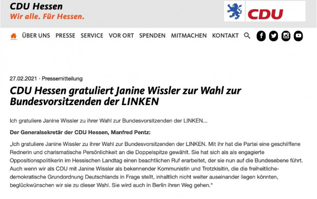 Im Namen der gesamten CDU Hessen gratulierte der hessische Generalsekretär Manfred Pentz der neugewählten Bundesvorsitzenden der LINKEN, Janine Wissler. Damit überging Pentz den Unvereinbarkeitsbeschluss der CDU, sich von der LINKEN abzugrenzen und nicht mit ihnen zusammenzuarbeiten. Er überschüttete Wissler sogar mit Komplimenten wie diesen: sie sei eine „geschliffene Rednerin“ und „charismatische Persönlichkeit“ mit „beachtlichen Ruf“. Nach den zahlreichen Komplimenten fügte Pentz hinzu, dass Wissler „Kommunistin und Trotzkistin“ sei, aber dass die CDU Hessen sie zur Wahl beglückwünsche.