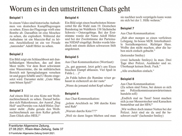 Die Wirkung der Veröffentlichung: Nun werden alle SEK-Beamten mit diesen acht abscheulichen Chat-Beispielen in eine direkte Verbindung gebracht. Differenziert wird nicht. Dabei stellen sich nun relevante Fragen: Woher kommen diese veröffentlichten acht Chat-Beispiele? Sind diese alle aus einem Chat – oder aus verschiedenen Chatgruppen?
