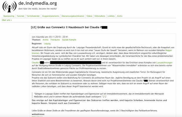 „Claudia P. .. ist verantwortlich für das Errichten eines Komplex von Luxuswohnungen auf der Wolfgang-Heinze-Straße in Leipzig Connewitz. Die ProjektentwicklerInnen von „Wassermühlen Immobilien“ erdreisten es sich eine bereits vorher durch StadtteilbewohnerInnen genutzte Fläche zur Profitmaximierung zu nutzen. Connewitz ist ein Ort des Widerstandes gegen kapitalistische Verwertung, rassistische Ausgrenzung und staatlichen Terror. Ein Rückzugsort für Menschen die sich an feministischen und sozialen Kämpfen beteiligen.