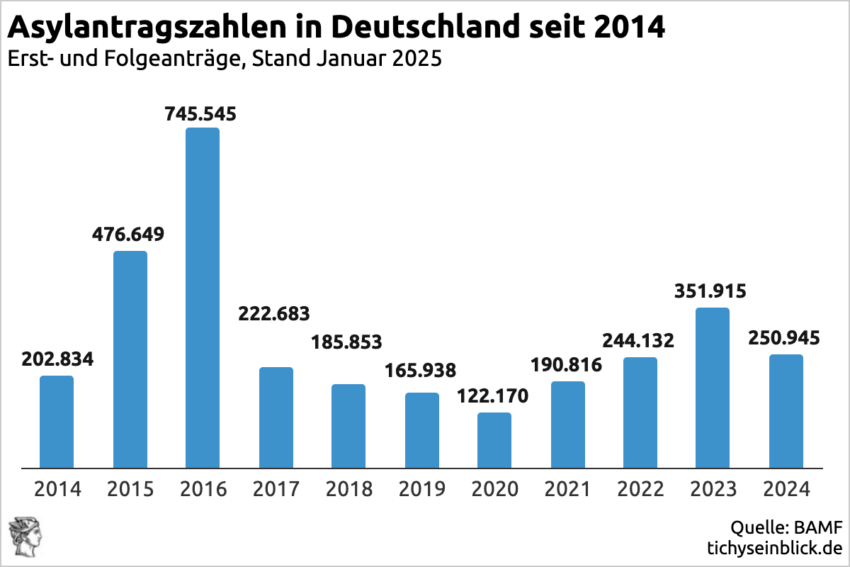 Asylanträge und „Familiennachzug“ zusammen verzeichnet Deutschland 2024 mindestens 370.000 irreguläre Einwanderer.