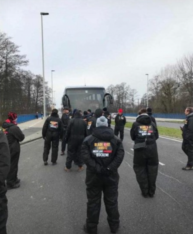 Blockierte Blockierer: Ein Bus der Ökoextremisten wird von Kohle-Befürwortern auf dem Stadtring in Cottbus aufgehalten (Quelle: facebook)