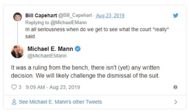Das Gericht musste daher davon ausgehen, dass Michael Mann dies nicht konnte und seine Aussagen und Daten falsch sind. Es wies daher jetzt die Klage von Michael Mann ab und beschloss die Einstellung des Verfahrens. Ziemlich schräg, zu behaupten, das Gericht habe die Thesen Balls als abstrus zurückgewiesen.