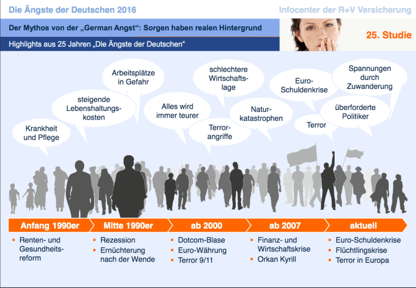 Alarmierende Nachrichten über Terroranschläge und gewaltbereite Extremisten, harte Auseinandersetzungen über die Flüchtlingskrise und die Einwanderungspolitik: Die aktuellen politischen Themen treiben die Sorgen der Deutschen auf Spitzenwerte – so das Ergebnis der repräsentativen R+V-Studie „Die Ängste der Deutschen 2016“. Bildschirmfoto 2016-07-12 um 11.40.00
