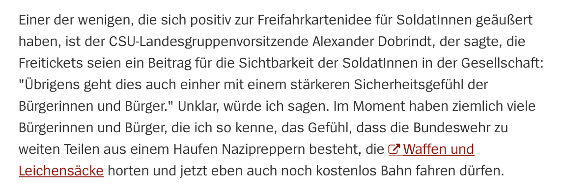 „Im Moment haben ziemlich viele Bürgerinnen und Bürger, die ich so kenne, das Gefühl, dass die Bundeswehr zu weiten Teilen aus einem Haufen Nazipreppern besteht, die Waffen und Leichensäcke horten und jetzt eben auch noch kostenlos Bahn fahren dürfen.“