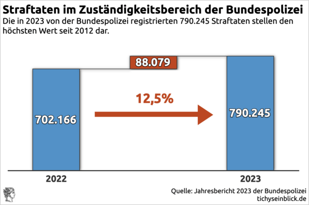 Mehr als die Hälfte aller Verbrechen – „Straftaten“ – im Zuständigkeitsbereich der Bundespolizei – rund 425.000 – wurden in Zügen, Bahnhöfen oder anderen Anlagen der Bahn begangen. Wobei für das Umfeld der Bahnhöfe die Landespolizeien zuständig sind, die dortige Kriminalität von der Bundespolizei also gar nicht erfasst wird.