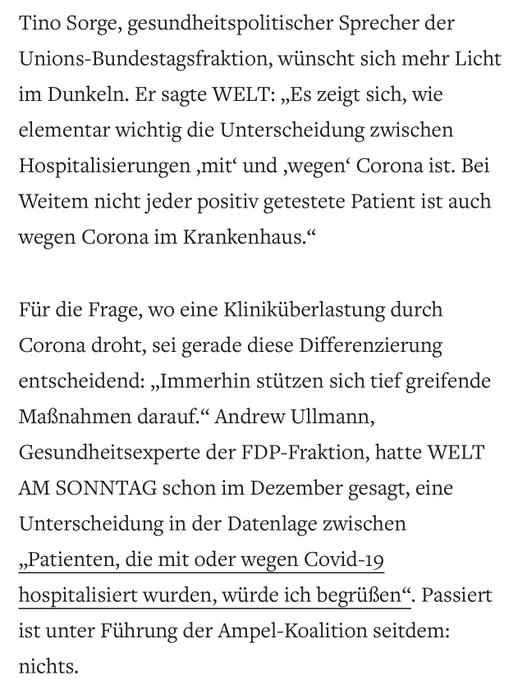 Ein Großteil der Covid-Patienten (aktuell 2/3) wird – gem. Daten des größten deutschen Klinikbetreibers Helios – nur wegen eines positiven Testergebnisses als Covid-Fälle gezählt (siehe Artikel von T. Röhn heute in der WELT, natürlich hinter der Paywall)