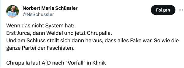 Man wird in den nächsten Wochen und Monaten sehen, was aus Tino Chrupalla wird. Es gibt in der jüngeren Kriminalgeschichte Beispiele, in denen Attentäter mit teuflischer biologisch-chemischer Expertise ihre Opfer mit deutlicher zeitlicher Verzögerung umgebracht haben (Rudi Cerne stellte kürzlich in Aktenzeichen XY einen solchen Fall aus Hannover vor, damals war es eine organische Quecksilberverbindung mit Langzeiteffekt gewesen, der die Ärzte erst nach Wochen auf die Spur kam. Leider gab es kein Gegenmittel. Das Opfer starb, der Täter ist bis heute nicht gefasst).