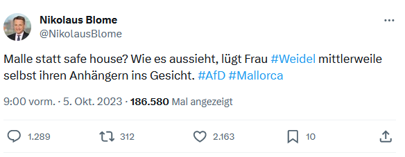Dazu passend eine Ergänzung vom CSU-Innenminister Joachim Hermann: Es sei erschreckend, „wie infam und hinterfotzig die AfD im Landtagswahlkampf versucht, aus den Vorfällen bei ihrer eigenen Klientel Kapital zu schlagen, ohne die Ermittlungen abzuwarten“. Na ja, man denke an die gefälschte Statistik zu den Anschlägen auf Asylanten-Unterkünfte für das 1. Hj. 2023: Da gab es mit Masse keine Ermittlungen, aber immer wieder: „Tathintergrund rechts“ (Nuis hat’s aufgezeigt). Also: Halt’s Maul … Wie „infam und hinterfotzig“ der CSU-Grande ansonsten eben selber ist: „Dass Weidel nicht auf Veranstaltungen auftreten konnte, lag wohl an ihrem Aufenthalt auf Mallorca.“