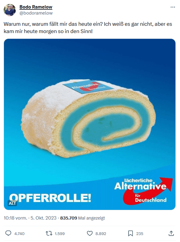Während sich die Hinweise verdichten, dass es eine Attacke auf den AfD-Vorsitzenden in Ingolstadt gab, die Staatsanwaltschaft ermittelt und zumindest als gesichert gilt, dass der Politiker wegen eines plötzlichen Zusammenbruchs ins Krankenhaus gebracht werden musste, reagiert der Thüringische Ministerpräsident Bodo Ramelow (Linkspartei) auf seine Weise. Auf X (vormals Twitter) verbreitete der Regierungschef eine Fotomontage, die eine Teigrolle mit blauer Füllung, das AfD-Logo und dien Schriftzug „Opferrolle“ trägt.