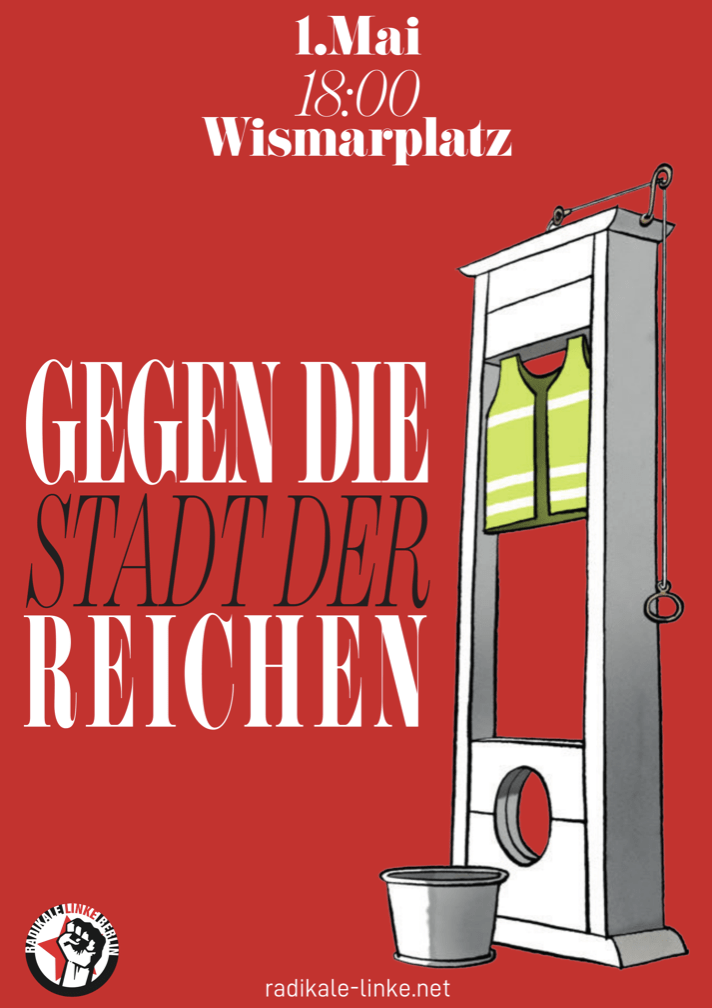 Heute findet eine Demo in Berlin-Friedrichshain unter dem Motto „Gegen die Stadt der Reichen!“ statt. Das Plakat, das zur Teilnahme aufruft, zeigt eine Guillotine.