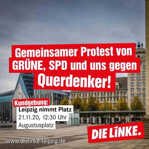 Allerdings kündigten schon drei Parteien im Stadtrat – Linke, Grüne und SPD – eine Gegendemonstration unter dem Motto „Leipzig nimmt Platz“ an. Sie rufen zum „gemeinsamen Protest gegen Querdenker“ auf. In ihrem Appell heißt es: „Bildet Bezugsgruppen! Wir rufen dazu auf, ihnen wortwörtlich den Platz zu nehmen!“