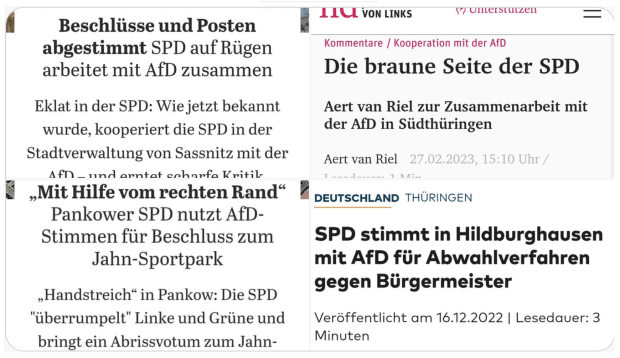 Bei der Behauptung handelt es sich um eine glatte Falschaussage. Denn die SPD kooperiert auf kommunaler Ebene längst mit den angeblich unberührbaren Rechteni. So wie übrigens auch die Grünen und sogar die Linkspartei. Sie sprechen nur öffentlich lieber nicht darüber. Im Stadtrat von Sassnitz auf Rügen etwa brachte die SPD gemeinsam mit der AfD schon 2019 mehrere Anträge auf den Weg, und sprach die Wahl von Ausschussvorsitzenden ab. Erst auf Druck der SPD-Landesführung beendete sie die Kooperation. Im thüringischen Hildburghausen betrieben SPD und AfD 2022 gemeinsam die Abwahl des Linkspartei-Bürgermeisters Thilo Kummer. Konsequenzen gegen die SPD-Stadträte – etwa Parteiausschlussverfahren – gab es nicht. Und im Stadtrat von Lübeck, beschwerte sich die CDU, habe die SPD im Januar 2023 mit AfD-Hilfe die Wahl des CDU–Kandidaten für das Amt des Bausenators verhindert.